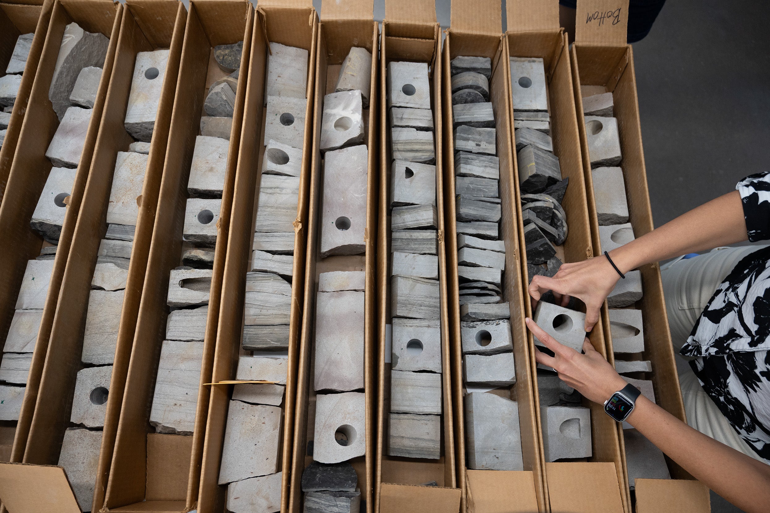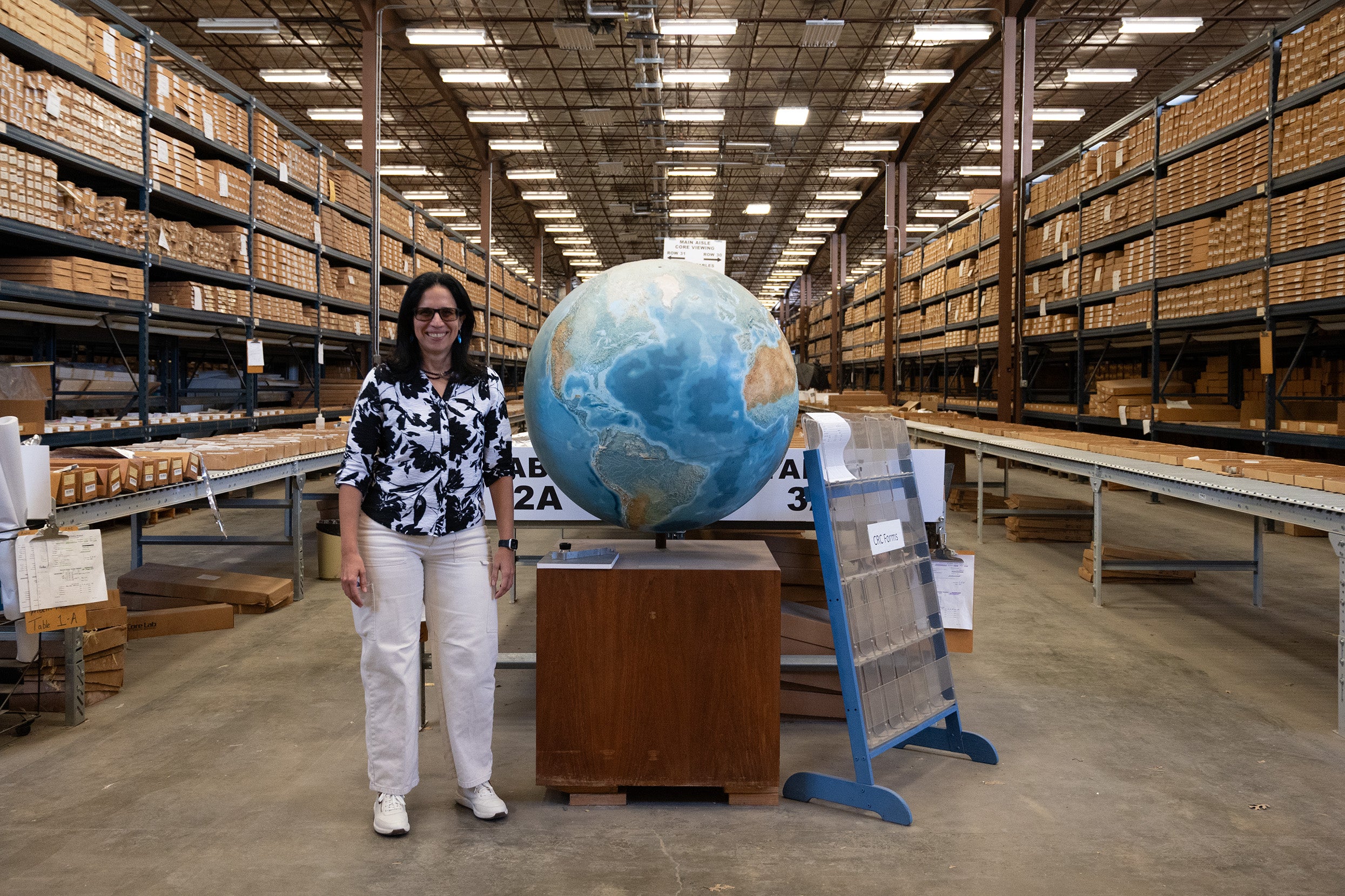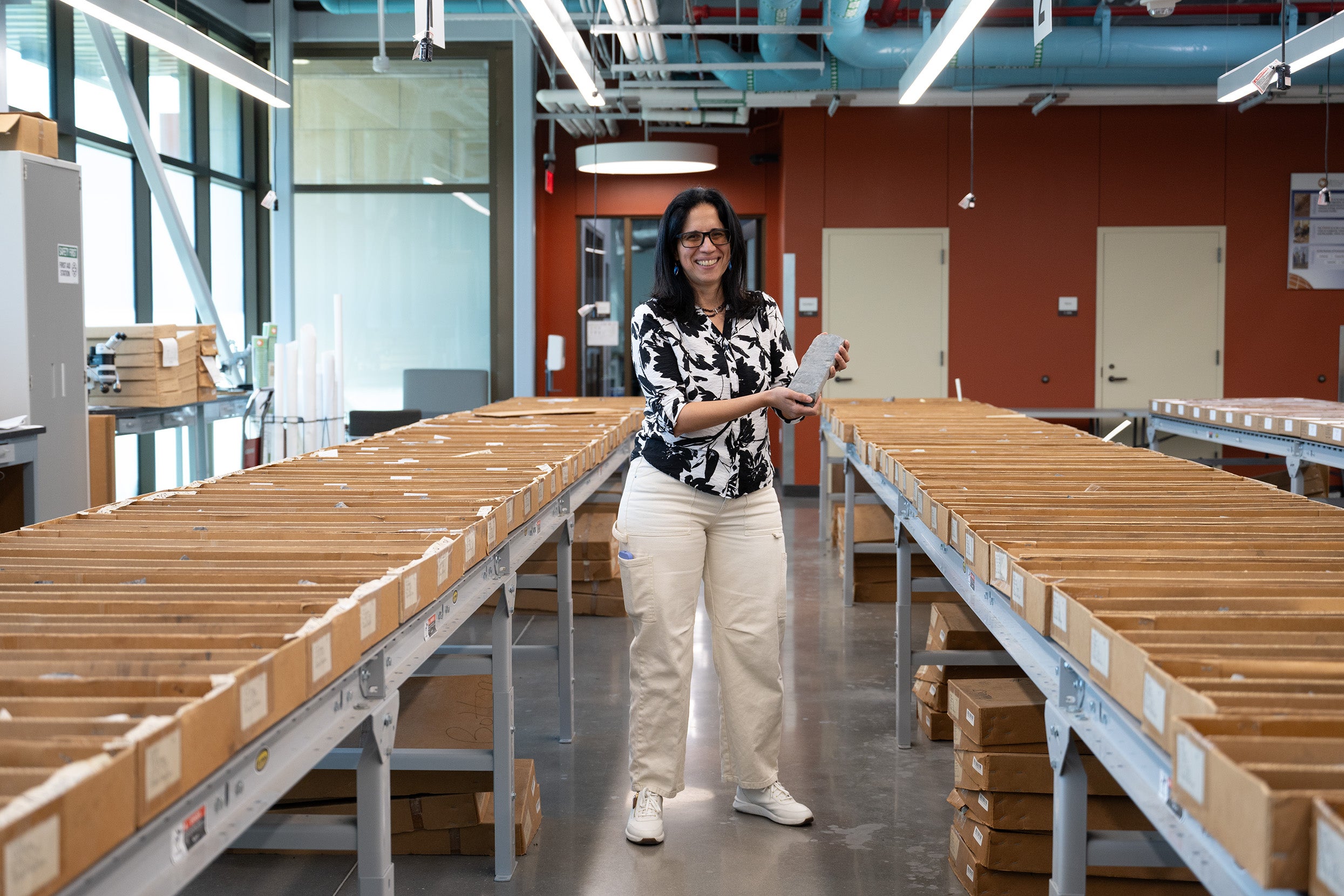 Seemingly endless rows stretch along the massive Austin Core Research Center of the Bureau of Economic Geology. Lorena Moscardelli walks through the corridors, gesturing to various artifacts stacked in carefully organized silver drawers. Moscardelli points out her favorite rock, sandstone, which she feels is fascinating because of the ways it tells a story about the landscape. The collections, all labeled with meticulous detail, tower to the ceiling.